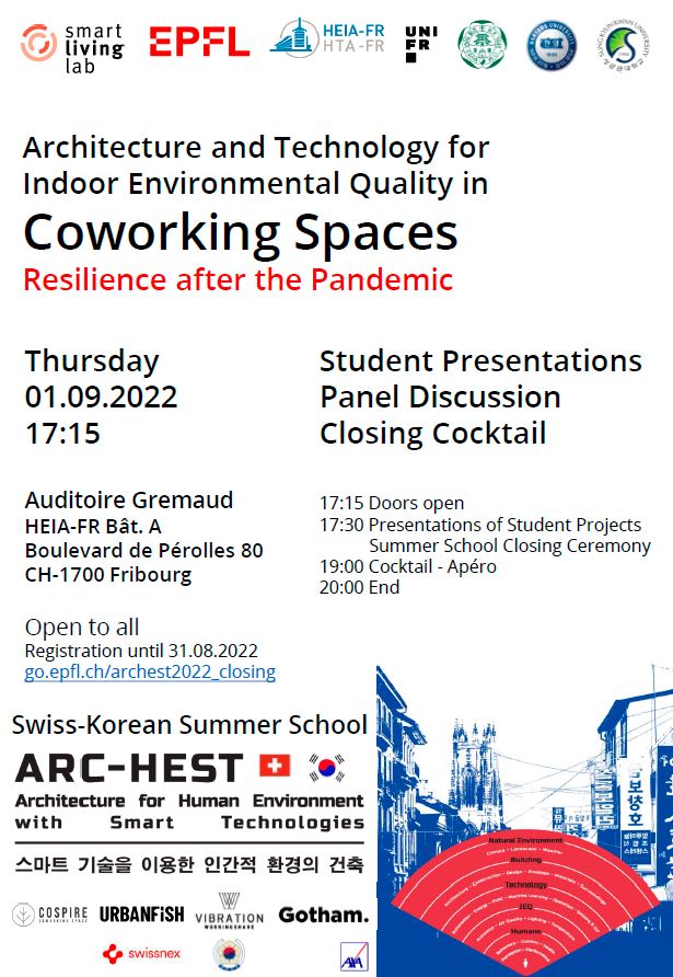 Open to 30 students from 6 universities in Switzerland and South Korea, the second edition of the ARC-HEST programme analyzes the synergy of architectural design, human factors, and technologies in the office buildings / coworking spaces and their combined effect on the indoor environmental quality. The topic of Summer comfort was investigated from 22 August to 1st September 2022 in Fribourg and the topic of Winter comfort will be studied in Seoul from 6 to 17 February 2023.