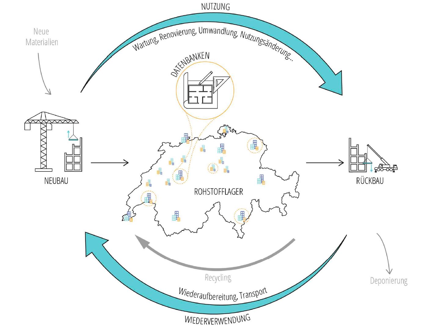 Um das Wiederverwendungspotenzial in der Schweiz zu bewerten, müssen unsere Städte und Bauwerke als Rohstofflager betrachtet werden. Um dessen Bauteile zu lokalisieren und auf ihre Wiederverwendbarkeit zu prüfen, braucht es einen genauen Überblick über den Schweizer Gebäudebestand und seine verschiedenen Bautypologien. Dies wird durch den Aufbau einer großen
