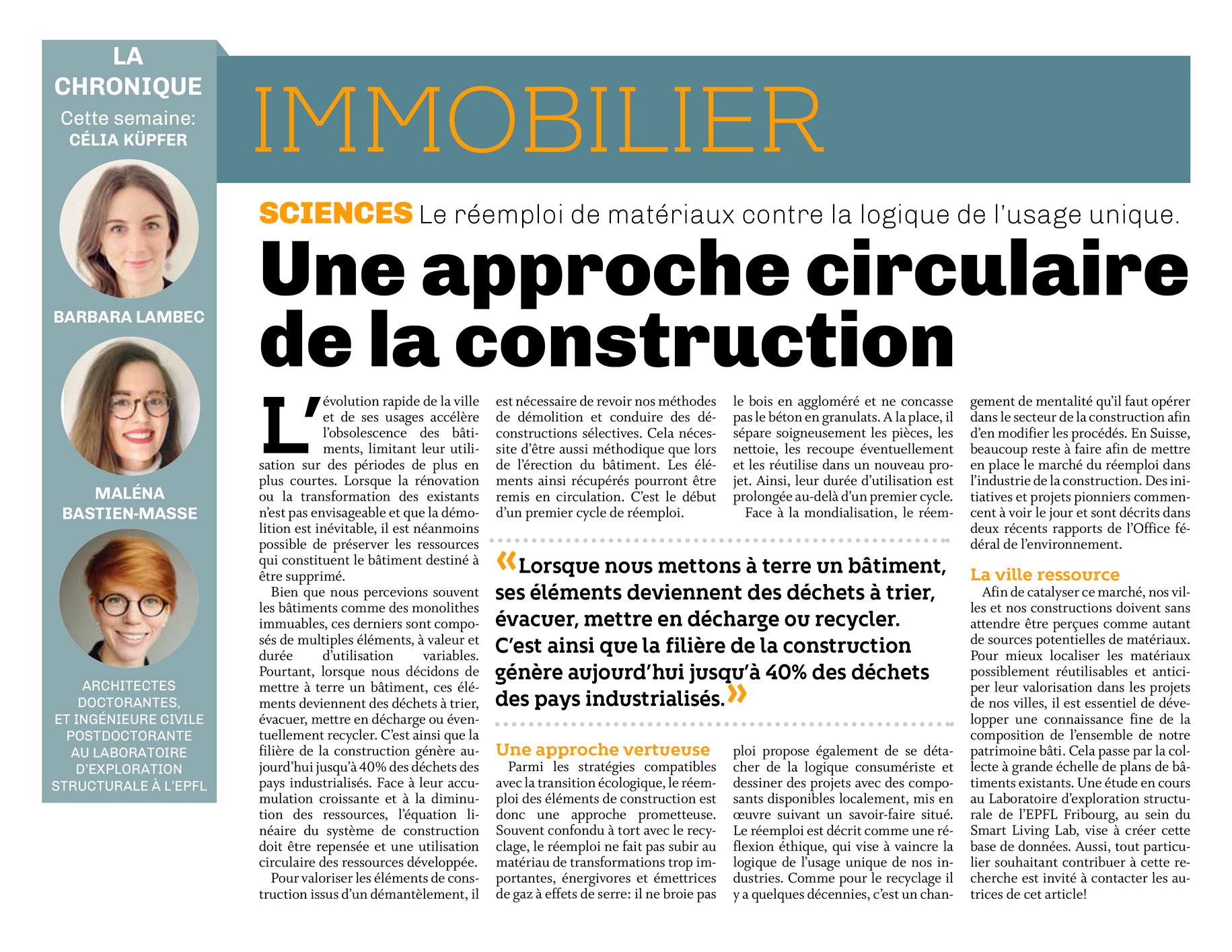 Le Structural Xploration Laboratory (SXL) de l’EPFL mène un projet de recherche, financé par le Fonds National Suisse (FNS), sur le potentiel du réemploi d’éléments de construction à grande échelle dans le bâti suisse, à travers la création d'une base de données de bâtiments localisés en Suisse. Tout propriétaire souhaitant contribuer à cette recherche est invité à contacter les auteurs de cette étude jusqu'à fin juin.