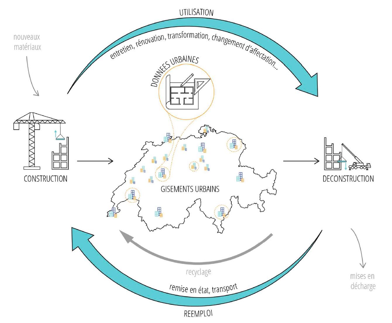 Afin d’évaluer le potentiel du réemploi en Suisse, nos villes et nos constructions doivent être perçus comme des réserves de matériaux. Pour mieux localiser les éléments possiblement réutilisables et anticiper leur valorisation, il est essentiel de développer une connaissance fine du patrimoine bâti suisse et de ses différentes typologies. Cela passe par la création d’une base de données alimentée de plans et de rapport techniques de bâtiments existants ou démolis, localisés partout en Suisse.