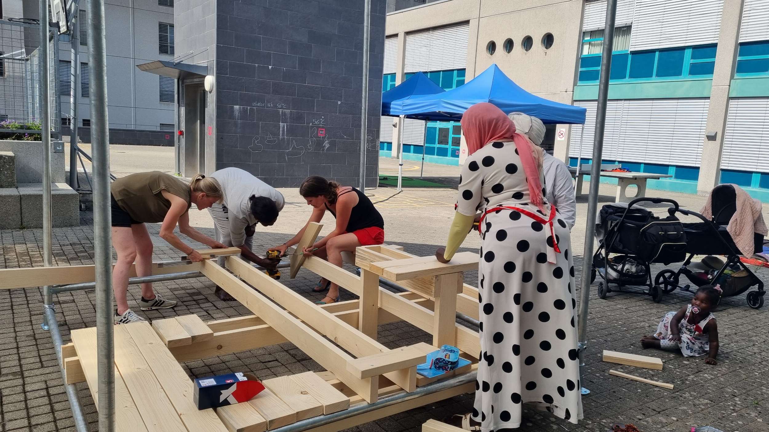 Dans un contexte urbain marqué par l’intensification des vagues de chaleur, rendre les espaces publics accueillants, inclusifs et résilients est un enjeu fondamental. La place du centre, au cœur du quartier du Schönberg à Fribourg – enclavée, minérale et particulièrement touchée par les îlots de chaleur – est un terrain de recherche et d’action pertinent, tant pour son potentiel d’amélioration que pour sa proximité immédiate avec le centre d’animation socio-culturel géré par REPER, porte d’entrée vers les publics du quartier. De plus, la place constitue un point de passage essentiel et un lieu de vie quotidien pour des centaines d’enfants.